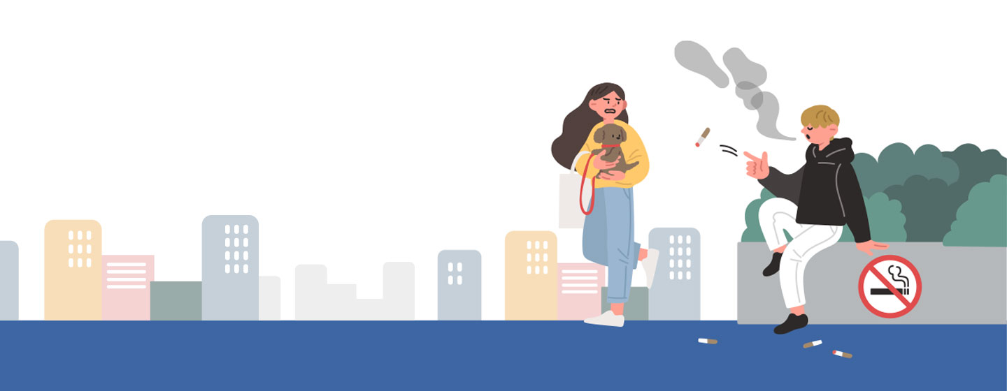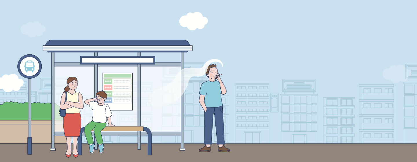 국민건강진흥법에 따라 지정되는 금연구역은 학교, 의료기관, 대형건축물, 실내체육시설, 음식점, PC방 등 실내공중이용시설과 금연거리, 지하철 출입구 및 버스정류소 주변 등의 실외 공공장소가 지정되어 있습니다. 주위를 배려하는 흡연 매너로 서로의 권리를 지켜주세요!